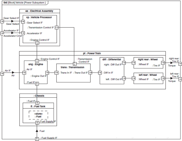 先前的活动图描述系统的组成部分如何交互来提供动力。系统的组成部分被表示通过活动划分在活动图中。车辆的内部模块图在图4.12显示组成部分如何来互联获得这种功能,和被使用来明确说明 组成部分之间的接口。这是一个系统的结构化视图和行为视图起被表示在活动图中。