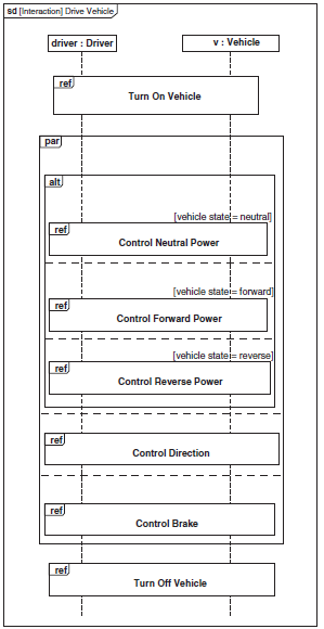 Drive Vehicle行为对应的用例在图4.4中,表示通过序列图4.5。序列图说明驾驶员和车辆之间的交互通过生命线顶部的名称说明。时间过程垂直向下。第一个交互是Turn On Vehicle车辆。紧随其后的是驾驶员和车辆Control Power、Control Brake和Control Direction交互。这三个交互平行出现说明通过par。alt在Control Power交互上,表示对应可选的,并说明Control Neutral Power、Control Forward Power或Control Reverse Power交互发生根据vehicle state作为条件显示在括号内。在第4.3.8节的状态机图说明vehicle state。Turn Off Vehicle交互出现在这些交互之后。