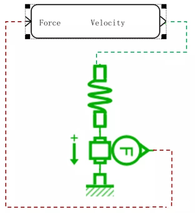 计算分析模型为某一维仿真简化模型,如下图所示,简化模型仅包含两个参数:弹簧末端加载速度和弹簧头部测量的受力。