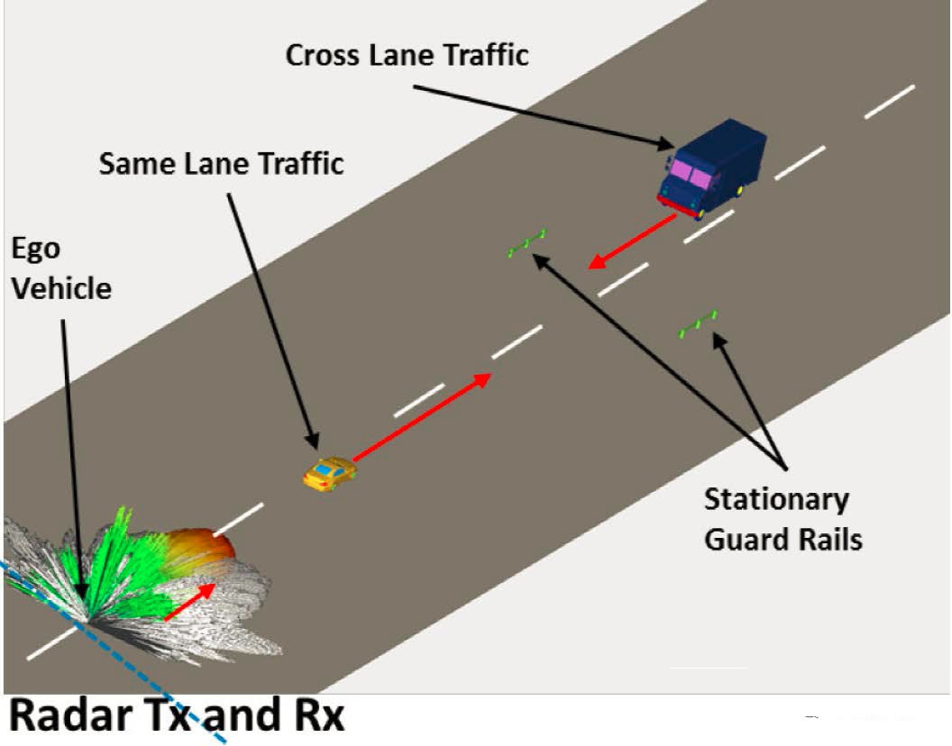 (d)对驾驶情境中的雷达进行的仿真:使用高保真度雷达仿真的降阶模型(ROM)能够创建出快速执行的高精度雷达模型,并将其应用到驾驶情境仿真中。
