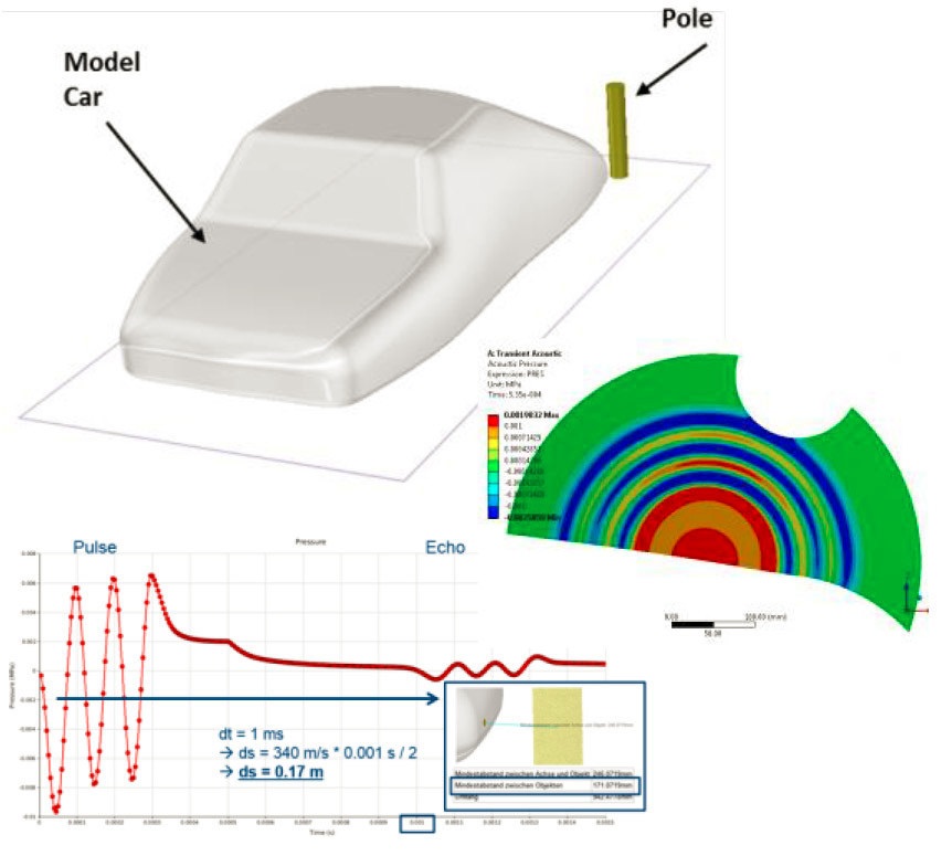 ANSYS仿真平台还包括用来对超声波传感器进行仿真的声学求解器。下图中的实例显示的是,当汽车朝着柱形杆倒车时,利用高保真度声波计算来仿真安装在汽车模型后面转角位置的超声波传感器的响应。