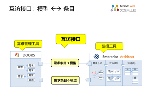 例如,需求管理工具DOOS和建模工具EA的对接方式如下图所示:
