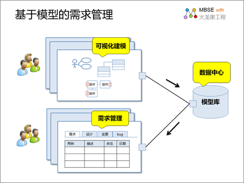 所以,更好的姿势是:把需求管理工具和建模工具都访问同一套工程数据,各自使用需要的形式,如下图所示: