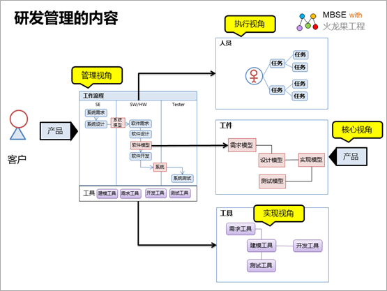 工件是产品本身的视角,我们最终要的既不是过程也不是人员,而是对外交付有质量的产品,这需要工程数据的支持:需求从用户角度描述产品,设计从实现角度描述产品,软件和硬件集成为产品,测试验证产品的最终质量。