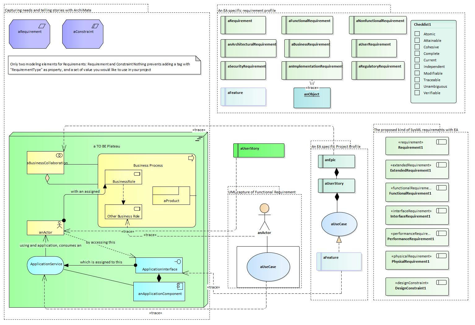 在EA这样的环境中,还可以很容易地跟踪每个社区产生的需求,即使用SysML的系统工程师、使用UML或敏捷社区产生用户故事和Epics的软件工程师,并将它们与将从中派生的ArchiMate需求相关联。