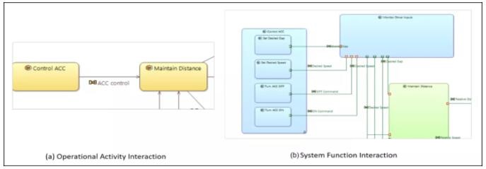图 12显示了执行“保持距离和控制速度”功能所需的全局/顶层功能。系统级功能分为外部参与者执行的参与者功能(蓝色)和系统功能(绿色)。在系统数据流图中,系统级功能必须被分解,因为它们部分地分配给了系统。例如,在图13(a)中,运行参与者“驾驶员”执行的活动“控制ACC”与“车辆系统”执行的“保持距离”活动相互作用。然而,在系统分析阶段,引入了ACC系统,它将继承“保持距离”功能。理想情况下,驾驶员和ACC系统之间没有交互,因为驾驶员-车辆接口将接收驾驶员输入并向ACC系统发送命令。因此,在图13(b)中,“控制ACC”功能将被分解为两个功能,即“控制ACC”和“监控驾驶员输入”,两者实现相同的运行活动。“控制ACC”(控制附件)功能的输出现在将从“保持距离”移到“监控驾驶员输入”,后者现在分配给“转向控制”执行器,“监控驾驶员输入”的输出将流到“保持距离”。此外,“控制ACC”功能被分解为几个子功能,接口直接分配给子功能。