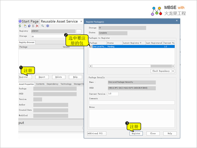在 EA 的浏览器窗口上选择要注册为资产的包,然后可重用资产窗口选择 Registry… 按钮打开注册包窗口,选中要注册的包,点击 Registry 按钮即可将包注册。