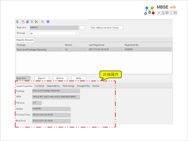 注册成功后,可在可重用资产服务的窗口下半部分的选项卡上查看最新注册包的详细信息。