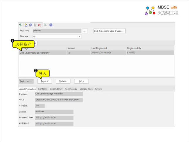 打开本地项目,项目启动后打开可重用资产服务窗口,连接指定注册表,在注册浏览器中选中要导入的资产,点击导入按钮即可将资产导入到模型中。在点击导入按钮时,会提示时导入单独的包还是包括可选中包有依赖关系的的相关包,用户可更具自己的需求选择。