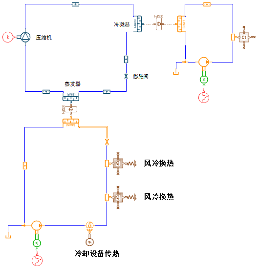 环控系统包括座舱供气和空气分配、座舱压力控制 、温度控制、湿度控制等。环控系统采用AMESim建立如下图所示,包括主散热系统、与燃油系统的热交换系统。