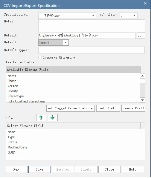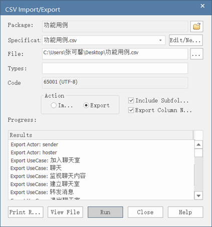 EA 可以将模型中的需求、用例、类等元素数据导出、导入为 CSV 文件,可以定义导出、导入时的属性,在导出、导入的 CSV 文件中成为表格的列名和数据。