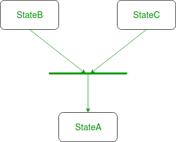 加入– 我们使用圆角实心矩形条来表示联接符号,其中包含来自联接状态的传入箭头和朝向共同目标状态的传出箭头。当两个或多个状态在一个或多个事件的发生时同时收敛为一个时,我们使用连接表示法。
