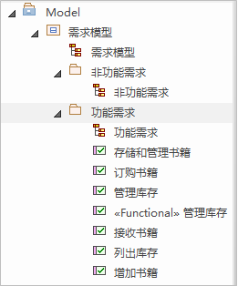 功能性需求是业务和技术团队之间的桥梁,它定义了系统必须为用户做什么,从而满足业务目标。 在 EA 的 “ 需求 ” 工具箱中,提供了功能需求元素,如下图所示 显示了来自同一个包的一组需求 。