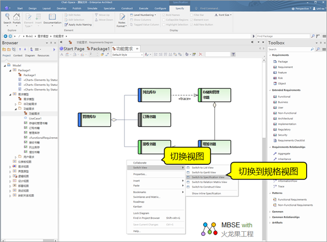 EA 支持使用项目浏览视图( Project View )、 规格管理器( Specification Manager ) 来浏览元素,并维持项目浏览窗口中的层次结构,其次还支持使用 仪表板图和柱状图,查看需求。