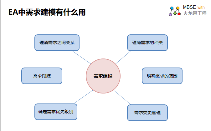EA 提供了对需求建模的功能,可以模型的形式分析需求之间的关系,对需求进行组织; EA 还提供了需求管理的功能,可以定义需求的属性(例如 需求的优先级、状态),然后对需求以列表的方式进行管理。