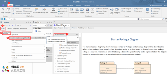 在功能区找到开始 — 》项目 — 》包 — 》使用向导添加模型,视图如下: