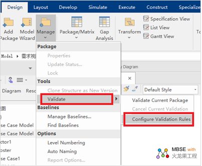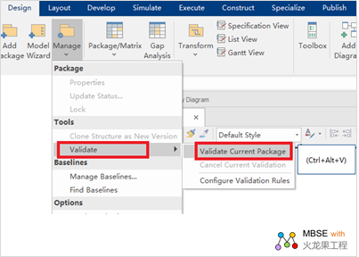 3.选定我们创建的图,然后点击菜单 Design > Package > Manage > Validate > Validate Current Package ( 设计 > 包 > 管理 > 验证 > 验证当前包 ) ,验证模型是否有问题。