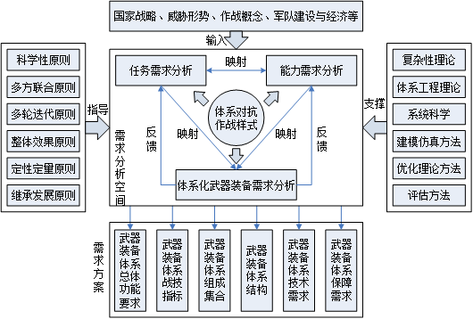 武器装备体系需求是指武器装备体系为了满足未来一体化联合作战需要必须符合的条件或具备的功能,是武器装备体系组织结构形式的描述。内容包括:一是为了完成一定作战任务或具备一定能力的武器装备体系所需具备的功能;二是描述这些功能、性能或相关约束的条件和规则(装备体系结构);三是构成装备体系的装备体系或子系统的数量规模。武器装备体系需求论证分析是在装备体系建设开始之前需要执行和完成的一个必经阶段,也是武器装备体系工程的首要阶段。全方位的体系对抗作战已经成为在信息化战场条件下作战的基本模式,如何根据未来作战模式下的新型交战样式,为打赢信息化条件下的战争,提出武器装备体系化建设的需求,并以科学的需求牵引各类型武器系统的均衡、协调发展,已经成为摆在决策者和论证者面前的一道难题。