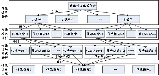 高层使命分析。根据国家安全战略、军队建设目标、未来战争预测等,综合考虑武器装备现状与体系化发展的内外部条件,科学提出武器装备体系的总体使命和目标,并根据作战环境、作战目的的不同将武器装备体系的总体使命分解为一系列比较明确的子使命,为牵引武器装备体系化发展建设指引方向。