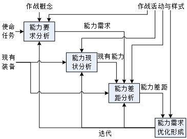 在需求分析框架中,围绕战场环境下体系对抗的作战样式,将作战任务需求分析、作战能力需求分析和体系、装备需求分析进行有机结合,通过不断循环迭代,科学合理地获得满足国家战略要求、能够应对多种威胁形势、实现预期作战效果的武器装备体系总体需求方案。面向任务基于能力的武器装备体系需求分析综合考虑多种军事威胁、整体作战效果和全寿命周期的作战任务与整体能力要求,它着眼于提高武器装备体系所担负作战任务的整体作战能力,注重长远军事能力的建设,体现了更高的前瞻性,符合一体化联合作战对武器装备体系化发展的基本要求。能力需求作为作战任务的内在要求,具有不可分割性,当作战任务需求发生变更时,能力需求可快速调整以适应变化。以作战能力需求为主线,以作战任务需求为主体,通过获取作战概念和任务要求,定义相应的作战能力需求,并经过需求分解、分配与映射,探索作战任务与能力需求的体系化武器装备实现方案,形成提出武器装备体系的发展需求方案。