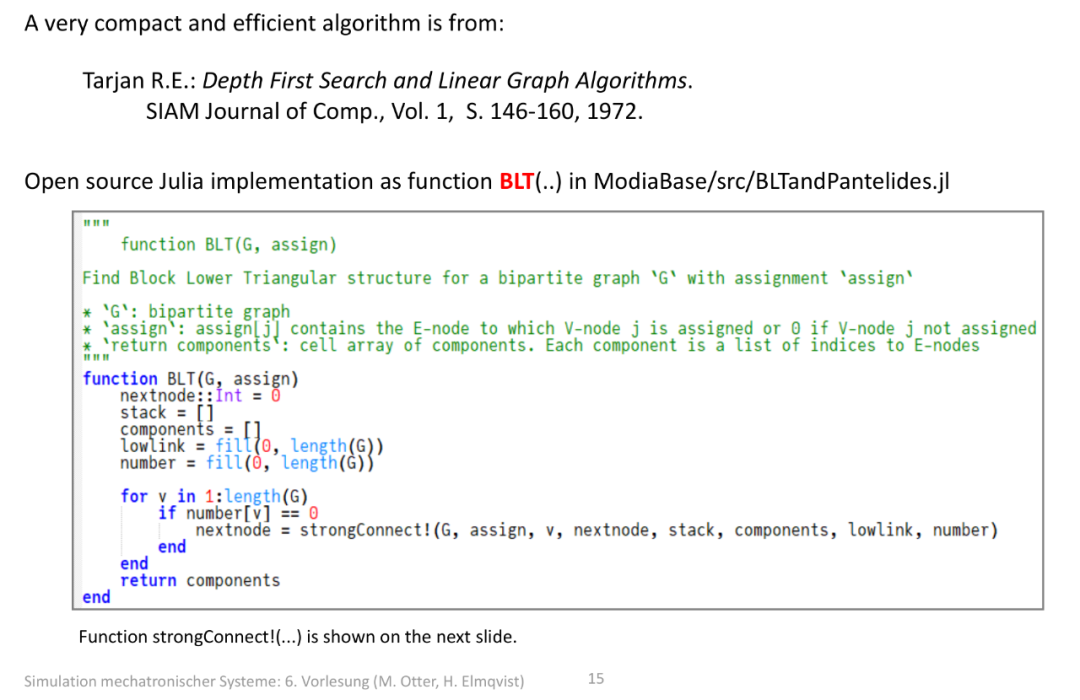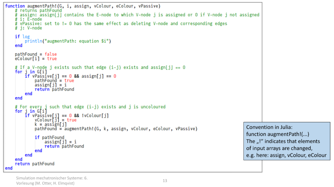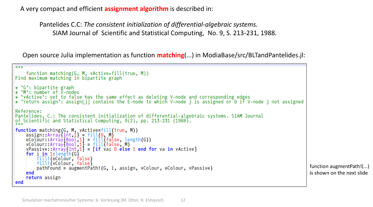 这个算法被封装为 Julia 函数 matching(...) ,位于开源库 ModiaBase 的 BLTandPantelides.jl 文件中,作用是 在 “变量 - 方程” 构成的二分图中,找到最大匹配 (即给尽可能多的未知变量分配对应的求解方程)。