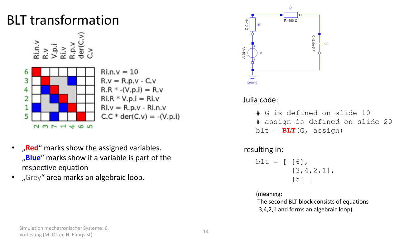 BLT 变换是处理 ** 微分代数系统(如电路)** 的关键步骤:它会把电路的约束方程组分解成若干 “求解块”,同时识别出 “代数环”—— 即方程之间相互依赖、无法顺序求解的循环,这类方程需要联立求解。