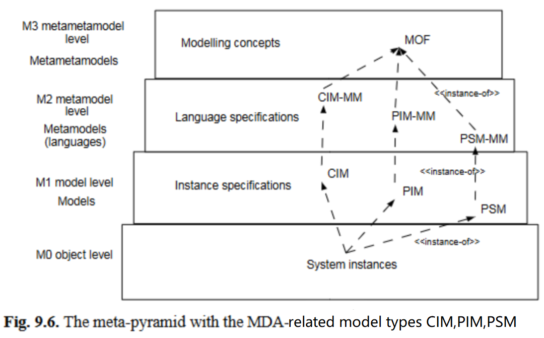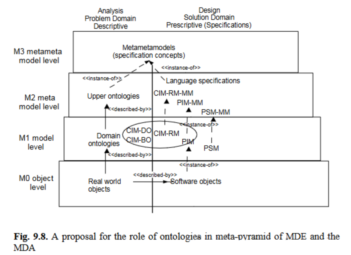 每个元模型涵盖PSM的不同主题领域:CIM-MM涵盖需求,PIM-MM涵盖平台无关概念,PSM-MM则添加平台相关问题。尽管这些模型都是规定性的(即采用实例关系),但问题依然存在:依赖“被描述关系”的本体论应如何融入元金字塔?这正是下一节要探讨的主题。