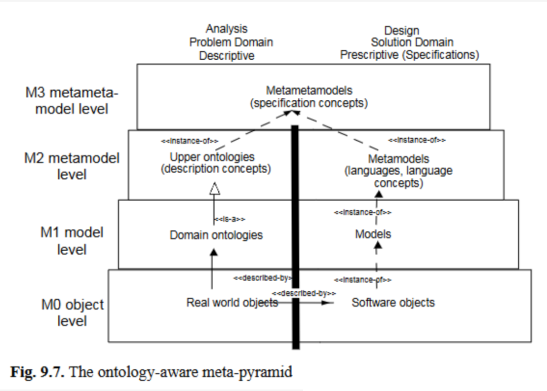 支持本体论的元金字塔的核心思想是:MDE中的大多数模型是规范,但可在不同元层级整合本体论作为描述性分析模型。由于本体论的描述性本质使其与规范有所区别,标准的M0-M3元金字塔可从仅使用规范模型扩展为同时使用本体论。