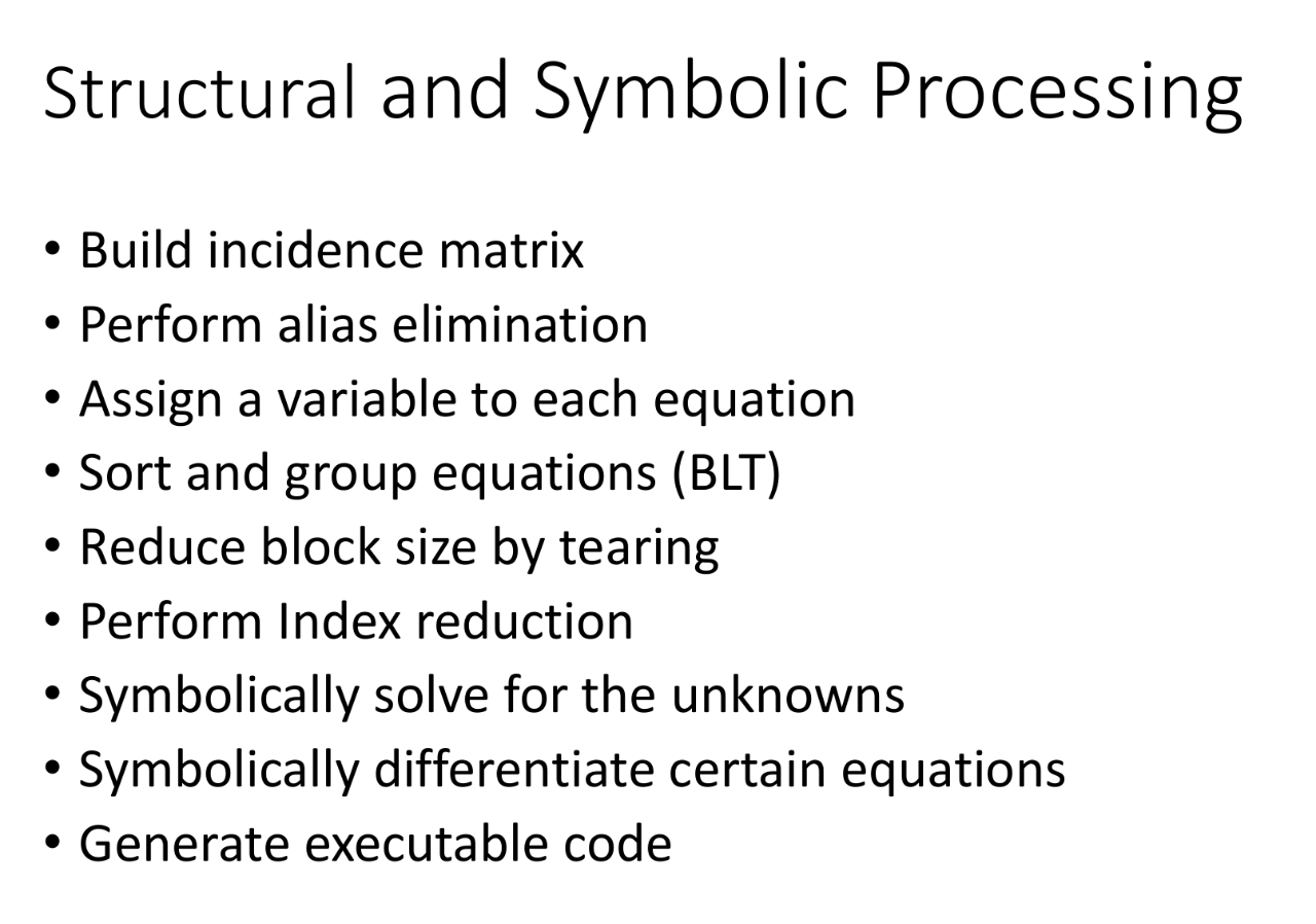 结构与符号处理”(Structural and Symbolic Processing)的流程步骤 ,通常用于复杂系统(如微分代数方程系统、工程建模等场景)的求解与代码生成,各步骤的含义及作用如下: