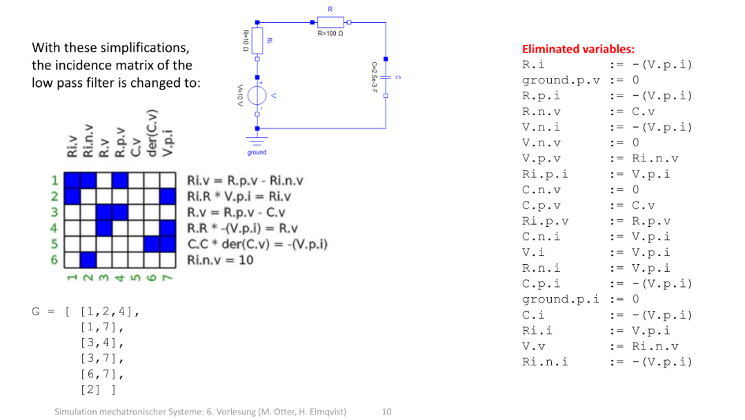 通过方程化简, 消去冗余变量 ,得到精简的变量关系(比如 R . i := − ( V . p . i ) 表示电阻电流与电压源端口电流的关系),目的是减少未知量,便于建立系统的微分方程 / 仿真模型。