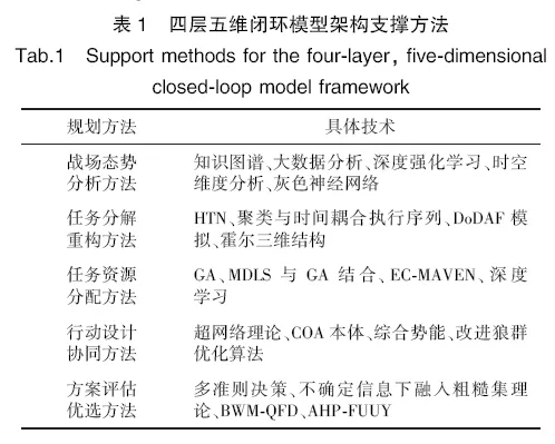 智能化、工程化的方法和技术是智能作战任务规划四层五维闭环模型架构实现的核心支撑。支撑方法如表1所示。