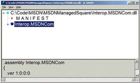 要查看该“托管视图”,我们可以使用 ILDASM.exe。此工具也是 .NET Framework SDK 和 Visual Studio .NET 附带的,它使我们可以查看包含在托管程序集中的元数据和 IL。当自定义类型库导入和导出过程时,您会发现此工具在 Interop 工作中是不可或缺的。通过对我们的 Interop 程序集调用 ILDASM,顶层视图将如下所示: