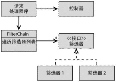 Filter的直接实现方式是一个筛选器链,这个筛选器链可以用来遍历一个由所有筛选器组成的列表。Web请求处理程序在将控制权传递到应用程序逻辑之前将首先执行筛选器链。