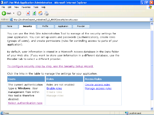 studio express中的WebSite菜单中的ASP.NET Configuration,这时会弹出一个新的页面窗口,其中选择Security选项,如下图: