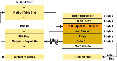 方法描述(MethodDesc)是CLR知道的方法实现的一个封装。有几种类型的方法描述,除了用于托管实现,分别用于不同的交互操作实现的调用。在本文中,我们只考察图3代码中的托管方法描述。方法描述在类加载过程中产生,初始化为指向IL。每个方法描述带有一个预编译代理(PreJitStub),负责触发JIT编译。图12显示了一个典型的布局,方法表的槽实际上指向代理,而不是实际的方法描述数据结构。对于实际的方法描述,这是-5字节的偏移,是每个方法的8个附加字节的一部分。这5个字节包含了调用预编译代理程序的指令。5字节的偏移可以从SOS的DumpMT输出从看到,因为方法描述总是方法槽表指向的位置后面的5个字节。在第一次调用时,会调用JIT编译程序。在编译完成后,包含调用指令的5个字节会被跳转到JIT编译后的x86代码的无条件跳转指令覆盖。