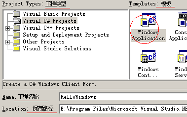 我们选择工程类型为Visual C# Projects,在模板中选择Windows