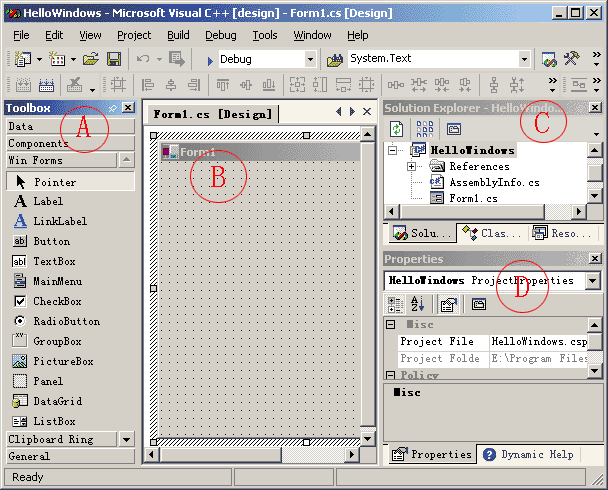 B区是我们的设计工作区(包括对界面、代码的设计),图中显示的是我们刚才新建的应用程序的主窗口:Form1。