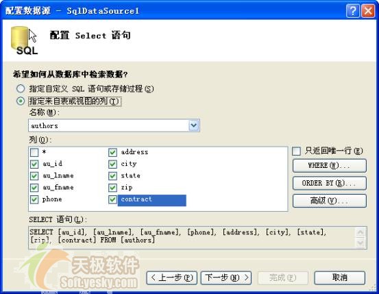 [city], [state], [zip], [contract] FROM [authors]"这正好和GridView所要绑定的控件一一对应,这充分说明了数据绑定控件和数据源控件的紧密联系。