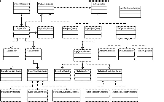 Grove ORM Development Toolkit包含Grove和Toolkit两部分内容。Grove为ORM提供对象持久、关系对象查询、简单事务处理、简单异常管理等功能。数据持久包括一些对象的Insert、Delete、Update、Retrieve等功能,关系对象查询则提供一些基于对象的复杂关系查询,包括对应到数据库功能的子查询、关联查询(JOIN)、函数支持(count、avg、max、min)、聚合等。Toolkit是基于VS.NET 2002/2003的VSIP开发的外接程序,职责是帮助开发人员快速映射关系数据库中的业务模型到符合Grove要求的映射实体类,以及映射数据库中复杂关系查询到Grove要求的关系映射实体,暂时只提供C#支持。图 2是Grove内部类实现关系图。