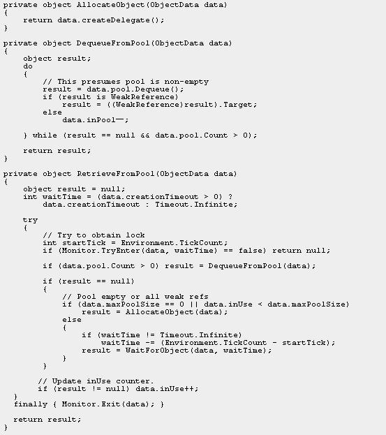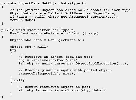 图 7 显示了 ExecuteFromPool 方法的代码,但移除了错误检查和注释。该代码使用私有方法从池中检索对象,并且调用所提供的委托。Finally 块确保了即使发生异常,也会将对象返回到池中。