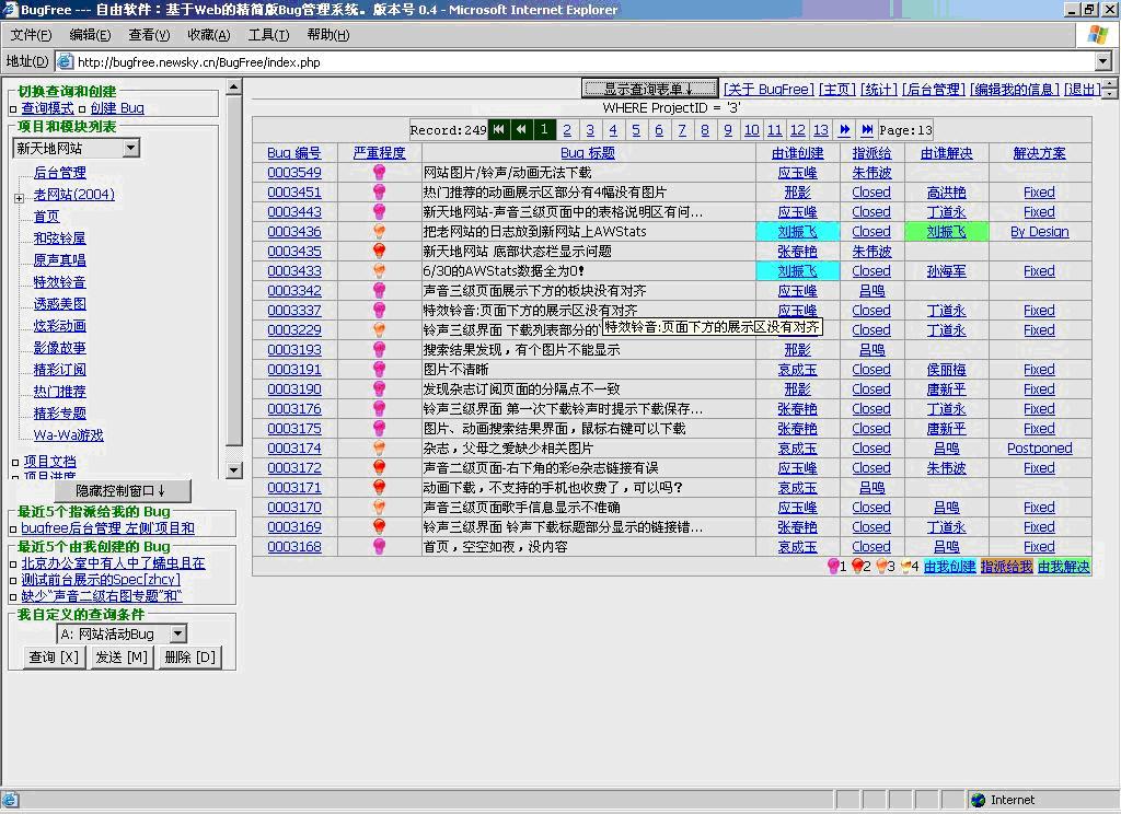 当网站后台管理编码完成后,4/28立即启动测试工作:后台管理中的首页管理、动画、声音、彩图、专题、资讯由专人负责测试,发现一个问题就在BugFree中记录一个Bug。通过BugFree的跟踪和记录,可以让某些问题不必累积到最后才解决。随着网站前台展示开发在5月中旬启动,测试工作也在并行跟进:每个频道、每个页面都有专人负责检查,这样尽可能的把各种潜在的问题揪出来,免除后患。