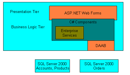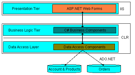 Shop 的整体逻辑体系结构如图 3 所示,设计的中心是在表示层使用 ASP.NET Web 窗体,与逻辑中间层中的 C# 业务组件通信。