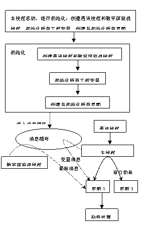 系统启动后,首先进行初始化所有工程变量,创建并初始化所有页面,并创建其他线程,包括通讯线程和数字屏监视线程,接着进入消息循环处理,有相应的消息到达,则交给相应的页面处理。