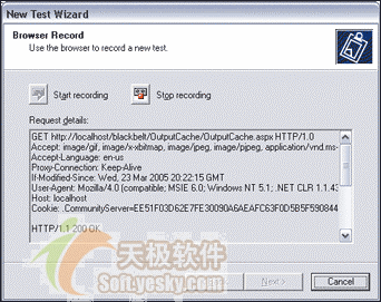 上面的对话框中的请求的详细信息部分现在被Application Center Test代理捕捉到的请求所填充了。这也是浏览器发送的HTTP请求。现在点击“停止记录”,接着点击“下一步”。你会得到一个提示,需要给该测试输入一个名称(我用的是“My