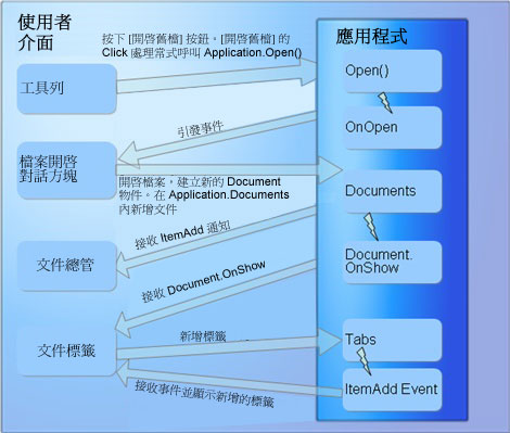 和 Application.OnOpen/OnSave 事件,而建立新檔、開啟檔案還有將檔案內容存入檔案裡的功能實際上是由它們提供的。下面程式碼將說明