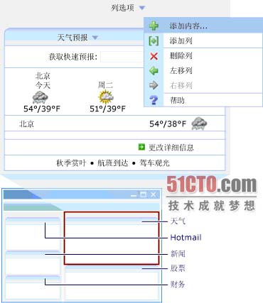 ①区域在页面布局中的用法。有两列可以包含控件:一列包含天气预报和股票控件,另一列包含Hotmail和新闻控件。这两列在Web