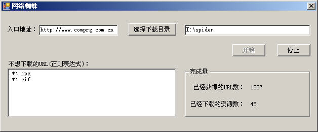 到现在为止,网络蜘蛛所有核心代码都已经完成了。下面让我们做一个界面来使下载过程可视化。界面如图3所示。