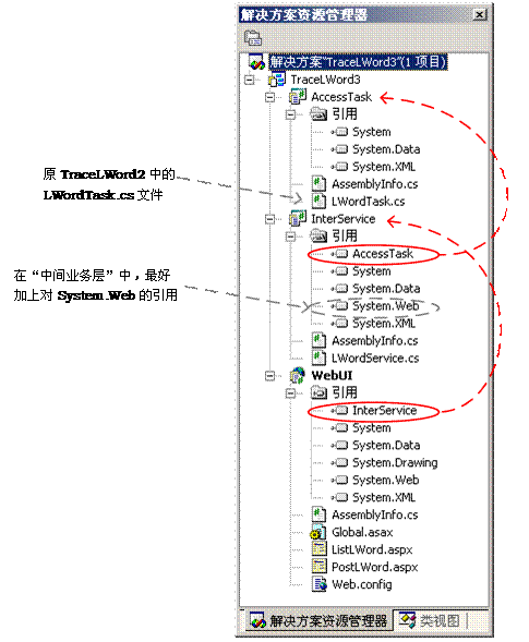 在新TraceLWord3中,应用了“企业级模板项目”。把原来的LWordTask.cs,并放置到一个单一的项目里,项目名称为:AccessTask。解决方案中又新建了一个名称为:InterService的项目,该项目中包含一个LWordService.cs程序文件,它便是“中间业务层”程序。为了不重复命名,TraceLWord3的网站被放置到了WebUI项目中。更完整的代码,可以在CodePackage/TraceLWord3目录中找到——