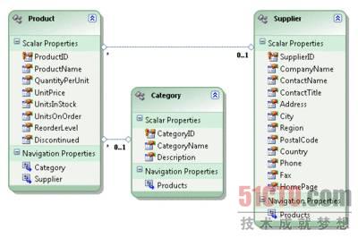 State Transfer (REST))暴露,它是一个基础服务,不是基于SOAP的服务,这意味着要替换掉SOAP封包,服务响应的有效负载只包括数据,不包括原数据(metadata),所有请求都使用HTTP动词(GET,PUT,POST等)和请求URI描述,假定你有一个如图2所示的模型描述Products,Categories和Suppliers,ADO.NET