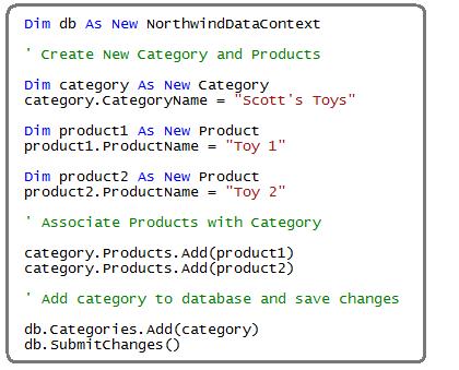 注意下边,我不用手工去维护主/外键关系,取而代之的是,我只向分类对象的“Products”集合中添加了两个Product记录,然后把该Category对象添加到DataContext的“Categories”集合中,LINQ